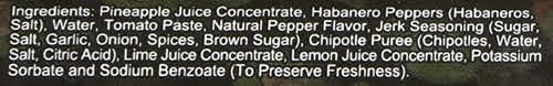 • Состав: Сок ананаса (концентрат), перец Хабанеро (хабанеро соль), вода, томатная паста, натуральный перечный ароматизатор, приправа для джерка (сахар, соль, чеснок, лук, специи, коричневый сахар), пюре из чипотля (чипотли, вода, соль, лимонная кислота), сок лайма (концентрат), лимонный сок (концентрат), сорбат калия и бензонат натрия (для сохранения свежести).